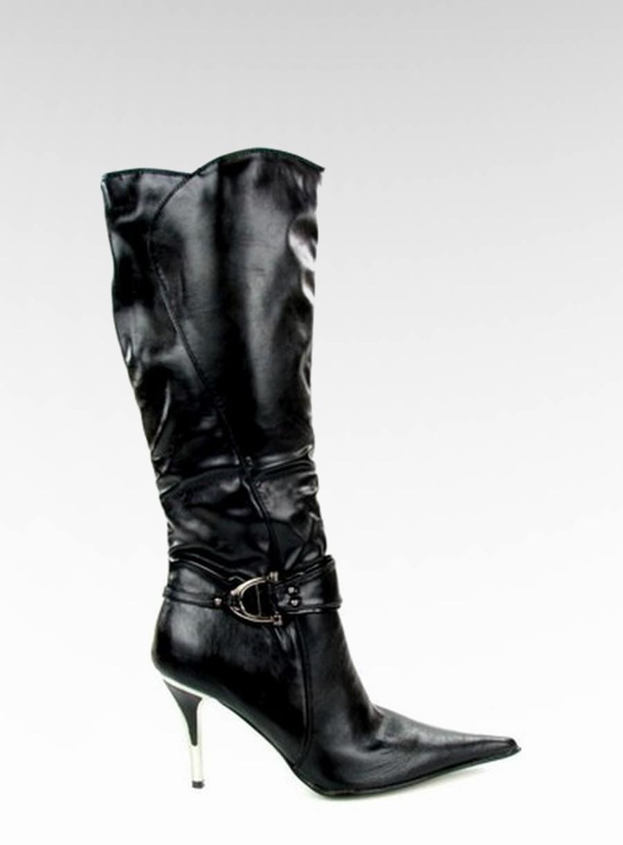 Botas elegantes e clássicas com salto fino de 9 cm de altura. Parte superior lisa e preta que chega até o meio da panturrilha, fechada com zíper - perfeita para o estilo noturno e do dia a dia.