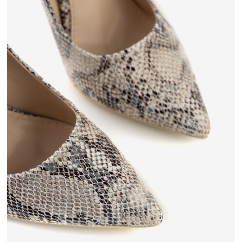 Detalhes: Salto alto bege no padrão de pele de cobra de Grace cinza