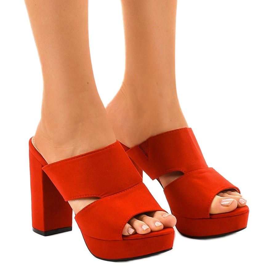 Aqui está a escolha perfeita para mulheres que desejam adicionar um pouco de elegância com um toque de vanguarda ao seu estilo - mules de camurça vermelha de salto alto 9R55. Estes atraentes chinelos distinguem-se por uma cor intensa que chama a atenção e recortes subtis que realçam o design moderno.