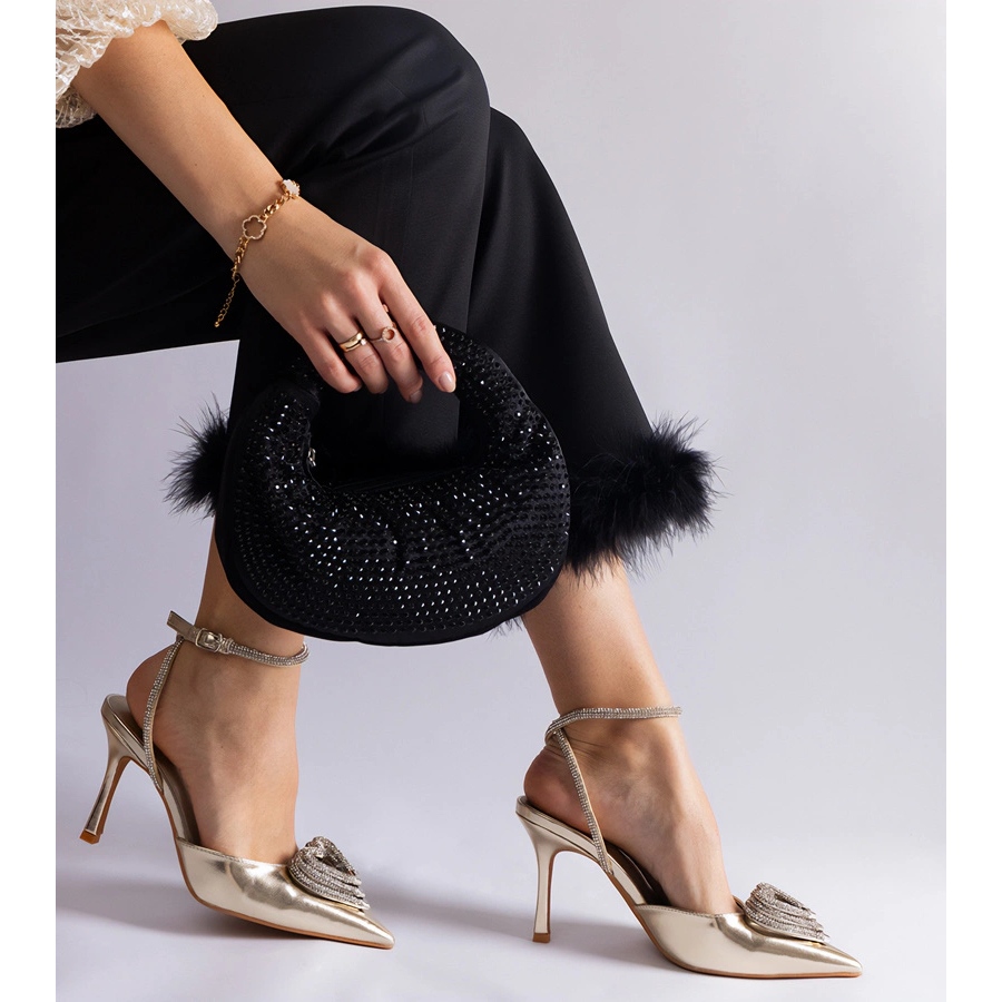 Detalhes: Salto alto dourado com salto aberto decorado com zircões
