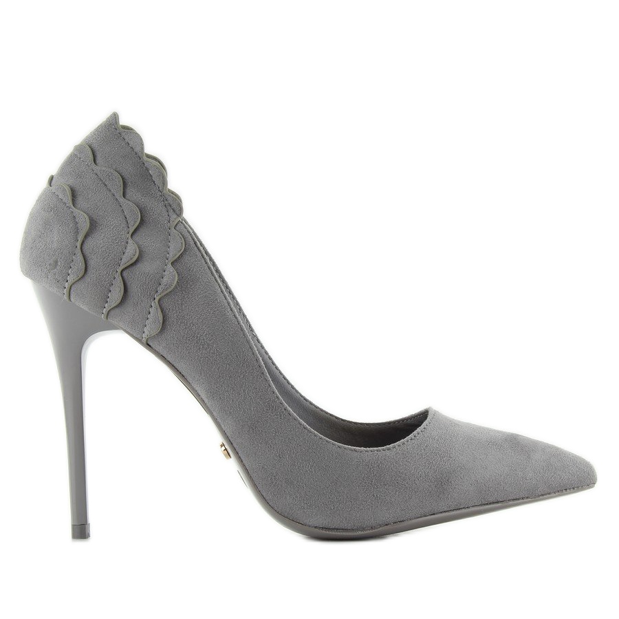 Os estiletes de camurça cinza com babados LE031 são a escolha ideal para mulheres que valorizam elegância e estilo sutil. Estes sapatos clássicos com salto fino de 10,5 cm distinguem-se não só pela estética, mas também pelo conforto de uso. Confeccionados em camurça ecológica carnuda, oferecem excelente qualidade e conforto o dia todo.