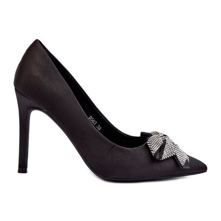 Saltos altos clássicos de cetim imitando tecido que adicionará estilo a qualquer estilização. Na frente, um belo laço decorativo decorado com strass/zircões cintilantes chama a atenção, enquanto o Spitz flagna as pernas. A inserção de couro ecológica garante o uso de conforto e um calcanhar de 10,5 cm enfatiza a figura, dando a elegância e feminino.