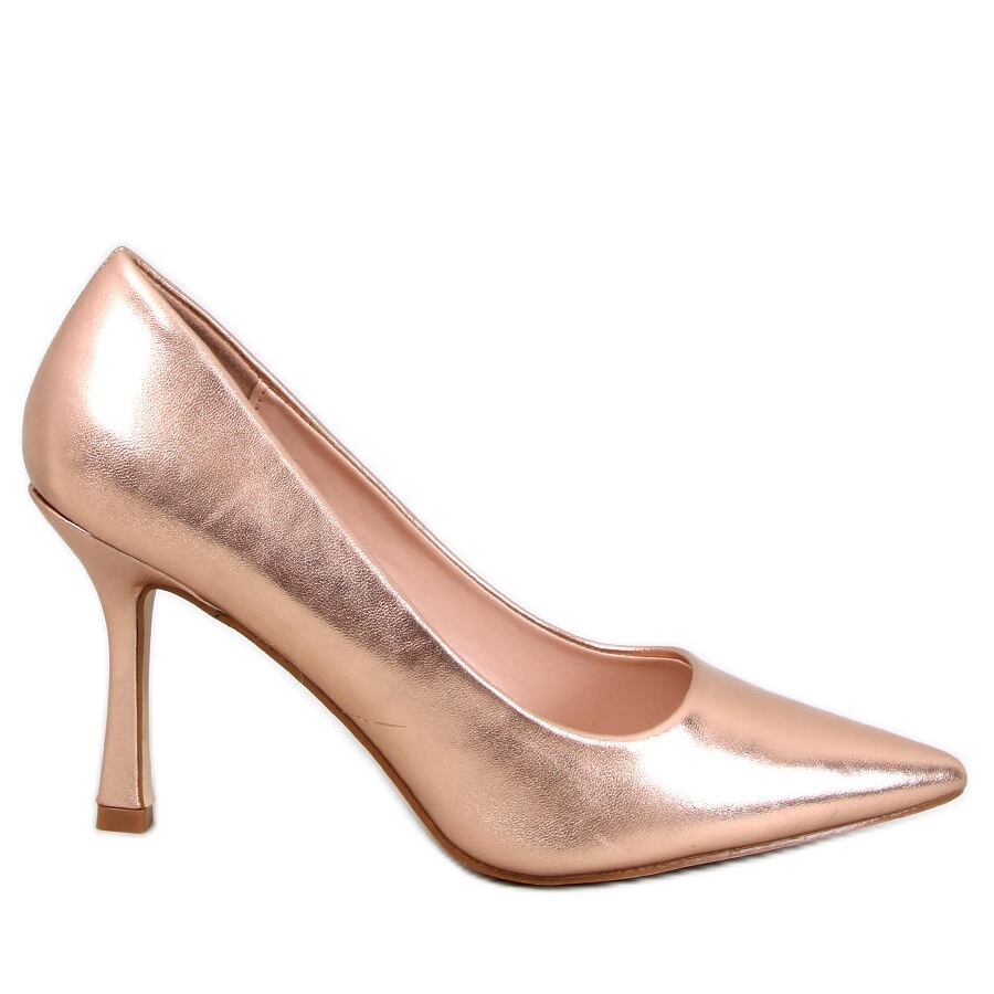 O modelo de champanhe, no tom de champanhe rosa, é um complemento perfeito para estilizações elegantes e cotidianas. A única única bege contrasta sutilmente com uma cor dourada metálica, dando ao todo um caráter incomum. Graças à inserção, essas bombas não são apenas elegantes, mas também confortáveis de usar.