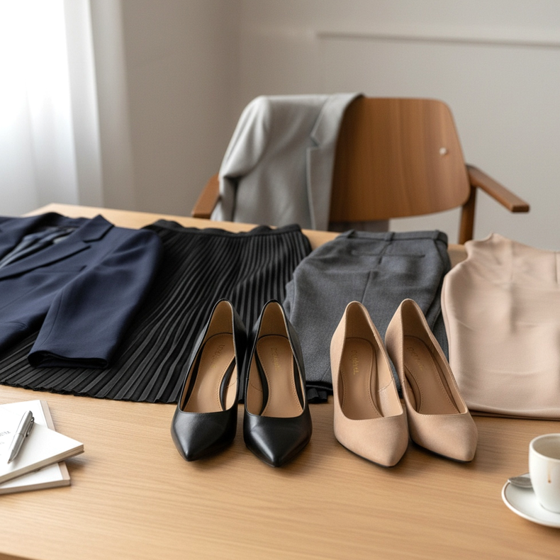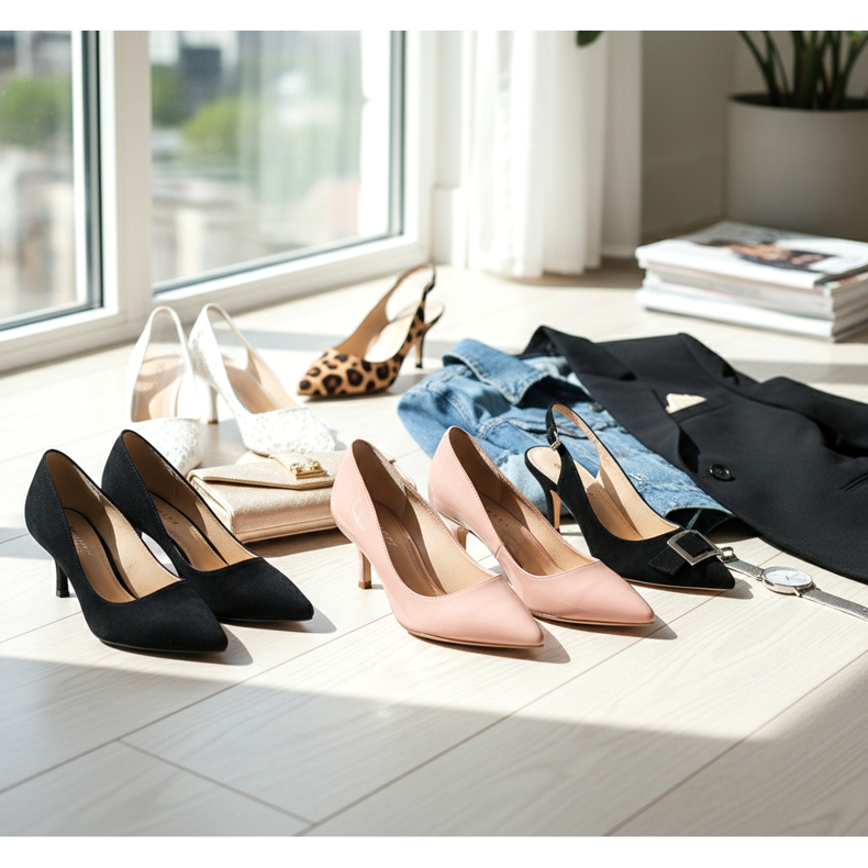 Os clássicos saltos gatinho pretos são absolutamente indispensáveis no guarda-roupa do escritório. Combinam com tudo – ternos, vestidos lápis, calças cigarro e saias midi. Sua versatilidade é imbatível.