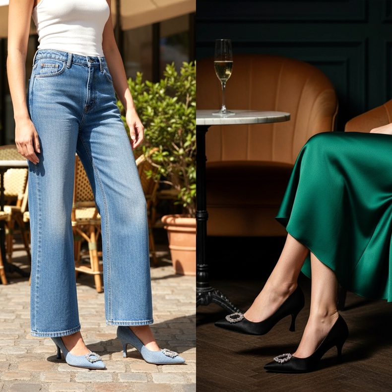 Para uma saída à noite com um vestido midi de cetim estilo vintage, os saltos gatinho são perfeitos. A delicada altura do salto e o corte clássico combinam com a estética mais tradicional e chique parisiense que domina em 2026.
