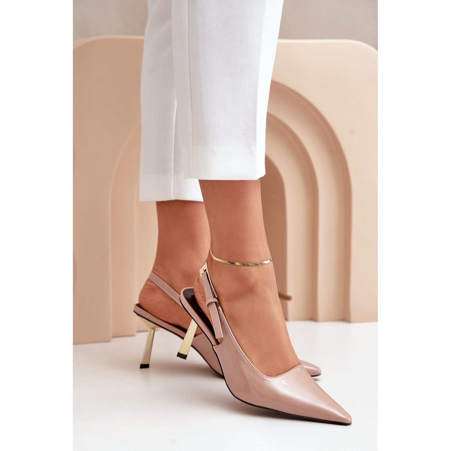O alfinete dourado e decorativo com uma altura de 8 cm enfatiza seu caráter exclusivo, e o nariz pontiagudo lhes dá uma elegância excepcional. Graças ao cinto ajustável com a fivela, os saltos altos se encaixam perfeitamente no pé, fornecendo não apenas uma aparência elegante, mas também conforto em usar.