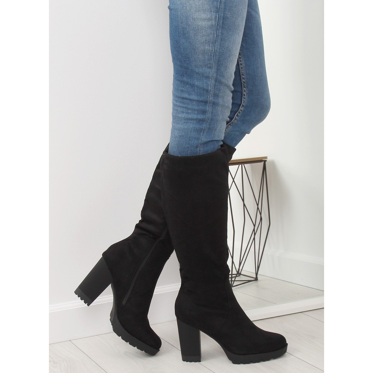 As botas são confeccionadas em camurça ecológica de alta qualidade, o que valoriza seu visual elegante. A parte superior na altura do joelho está equipada com um prático zíper que facilita a colocação e a retirada. O interior das botas é forrado com pele delicada, garantindo conforto e aconchego mesmo nos dias mais frios.