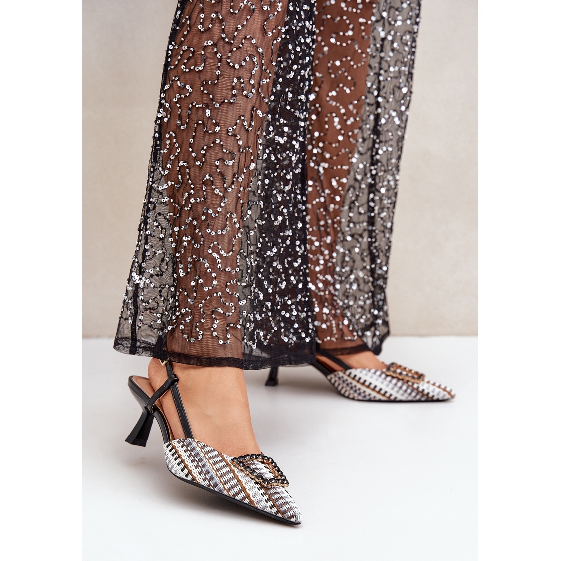 Apresentamos os elegantes saltos altos das mulheres negras, o que se deleita não apenas com a aparência deles, mas também com um estilo único. Este modelo é distinguido por um salto ao ar livre e uma ferramenta Spitz, que alonga opticamente as pernas, adicionando leveza e esbelta à figura. A decoração com zircões na frente lhes dá um charme único, tornando -os uma ótima opção para passeios noturnos, casamentos ou outras ocasiões únicas.