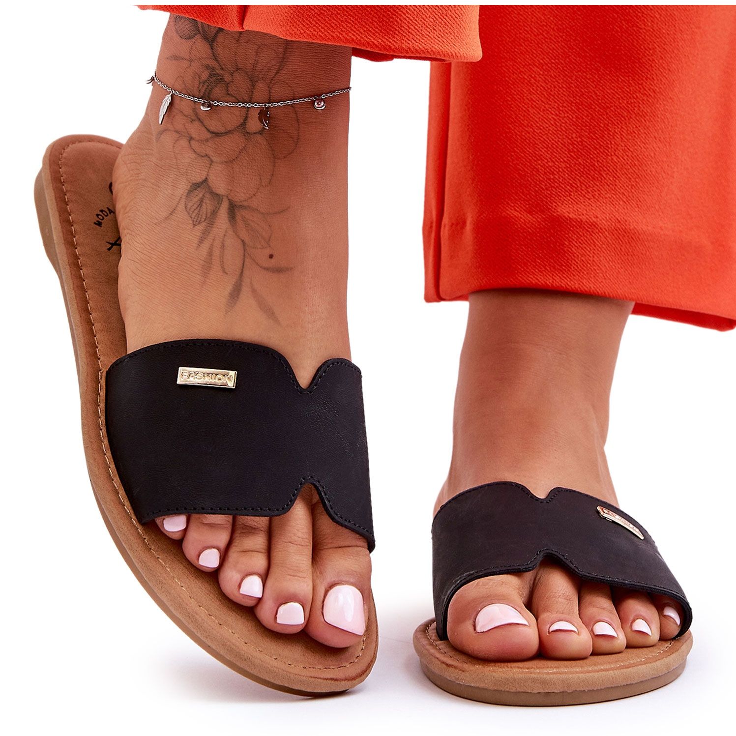 As retalhos de coralina pretos e elegantes feitos de couro ecológico são um guarda-roupa de Spring-Summer-Summer obrigatório. O modelo combina uma forma simples e atemporal com conveniência: uma estrutura deslizante, um nariz descoberto e levemente arredondado e uma assadeira decorativa na frente adicionam um estilo sutil. Perfeito para passear, trabalhar ou fazer compras.