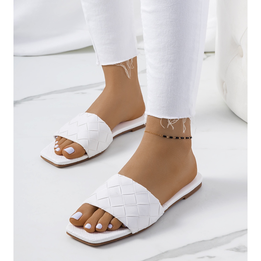 Os chinelos brancos Mabel estão disponíveis nos tamanhos padrão 36-41, o que facilita o ajuste do pé. A sola de plástico bege torna-os leves e elegantes, e a falta de biqueira torna-os extremamente arejados.