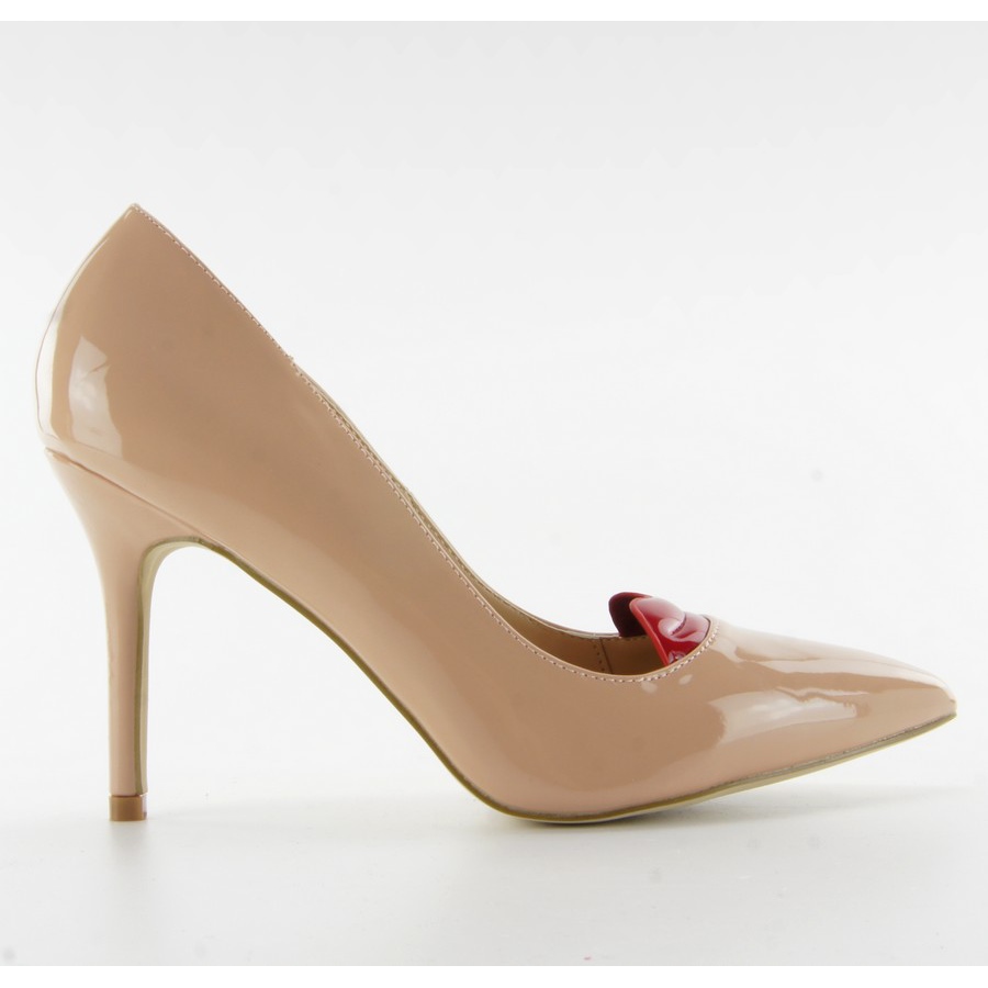 Sapatos rosa originais com aplicação labial - uma combinação de clássico e divertido. A superfície envernizada em tons de marrom e bege com um distinto acento vermelho em forma de lábios no nariz chama a atenção e confere ao estilo um caráter único. O salto de 9,5 cm de altura alonga a silhueta mantendo um corte elegante e feminino.