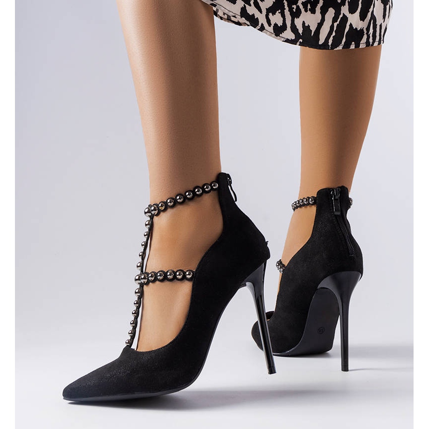 Detalhes: BM Saltos pretos decorados com uma faixa Prunella