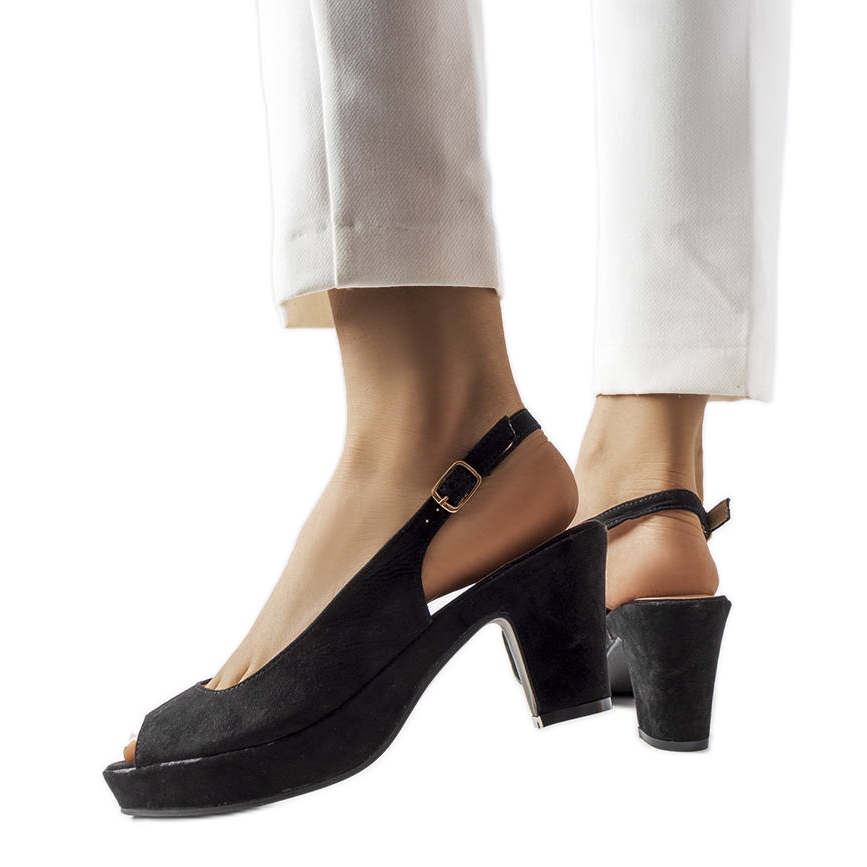 As sandálias pretas no Post Dionne combinam uma forma clássica com o minimalismo moderno. Feito de camurça ecológica e salão ecológico, com uma confortável inserção de couro ecológico e uma sola de plástico durável. O salto de 7 cm de altura fornece uma certa etapa, e a fivela ajustável permite um ajuste perfeito.