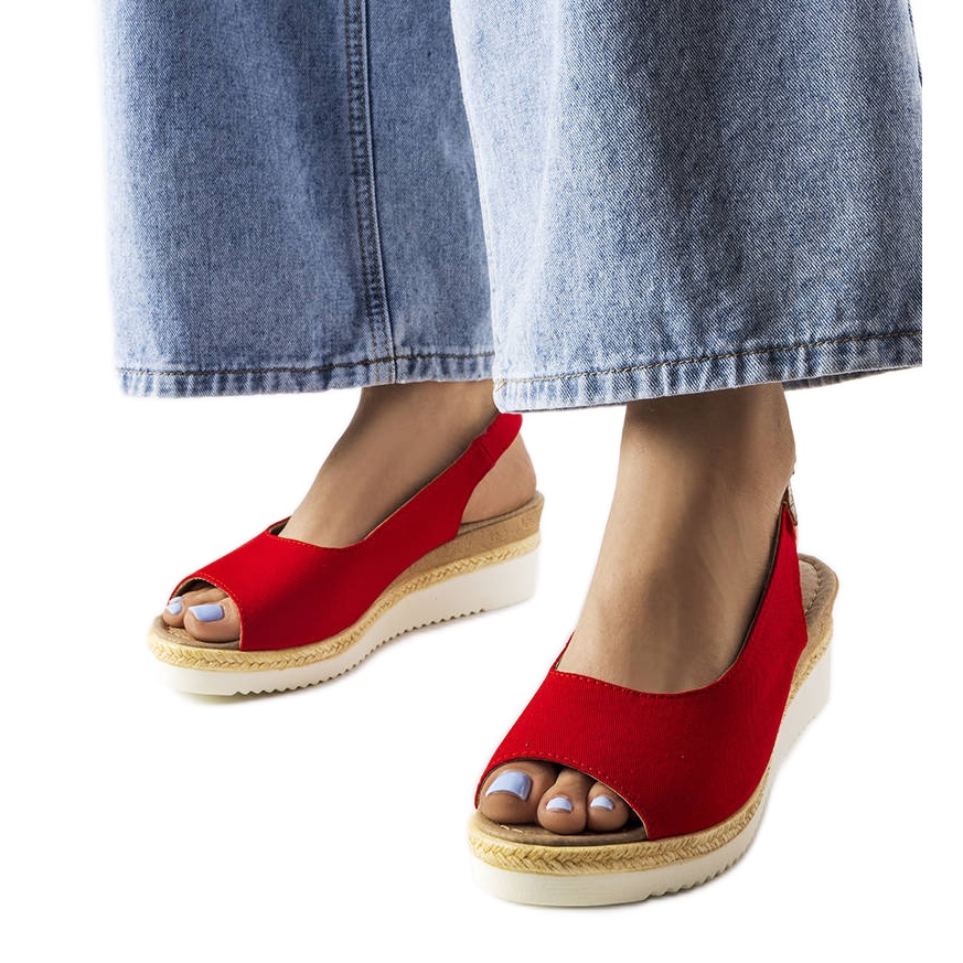 Big Star JJ276048 Sandálias vermelhas - alpargatas elegantes e confortáveis que atualizam todo estilização de verão. O modelo em um tom intensivo de vermelho combina uma aparência elegante com soluções práticas: um banco de 6 cm de altura garante suporte estável e extensão óptica da silhueta, e a sola de plástico branco leve acrescenta contraste moderno. Um tecido de alpargelo superior e uma inserção de couro garantem a respirabilidade e o conforto de usar o dia todo. O fixador de fivela ajustável permite que você combine as sandálias com o pé, e a falta de nariz enfatiza o caráter de verão do sapato.