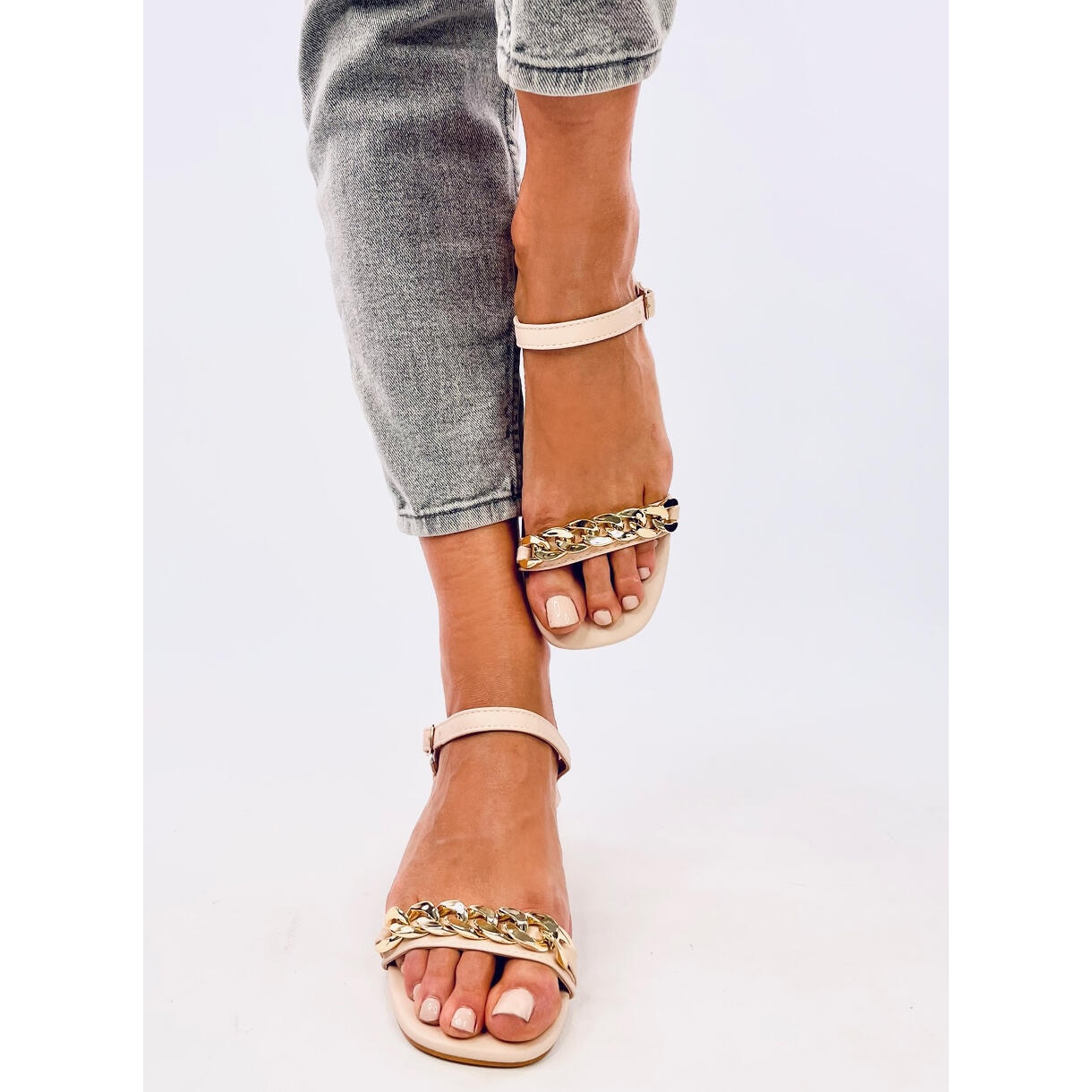 As sandálias disponíveis em uma elegante cor bege se misturam bem com várias estilizações, de casual a mais elegante. Seu padrão suave os torna extremamente universais e se encaixará facilmente em qualquer guarda -roupa.