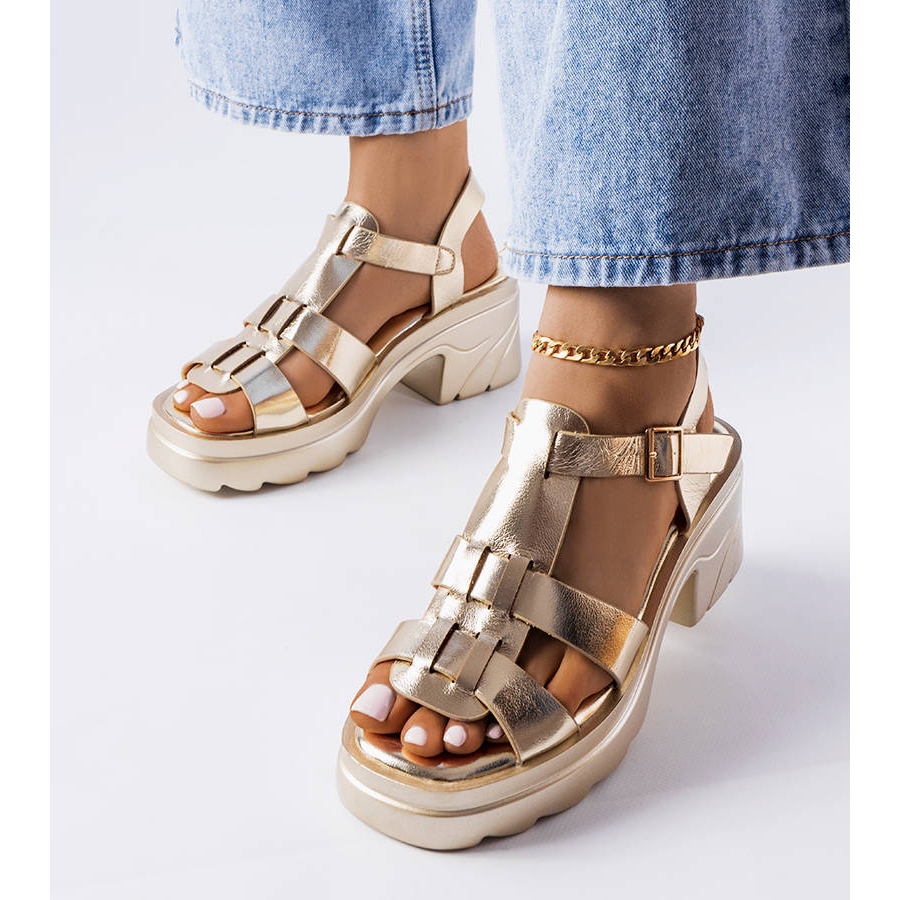 Elegância única e esplendor das noites de verão - é isso que significa o nome BM Golden Sandálias com salto bloco Sunset. Estas atraentes sandálias são obrigatórias no guarda-roupa de toda mulher que deseja adicionar um toque de luxo ao seu estilo de verão.