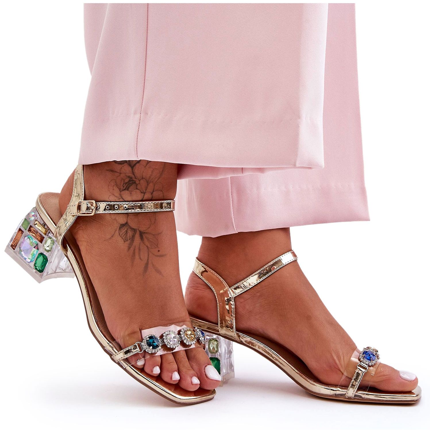 Sandálias femininas elegantes e confortáveis feitas de couro ecológico e plástico. Motivo em um pistão estável e com bainha baixa (5,5 cm), decorada com um acabamento metálico. Strass delicados na frente adicionam brilho e fazem o modelo funcionar bem diariamente e para passeios noturnos.