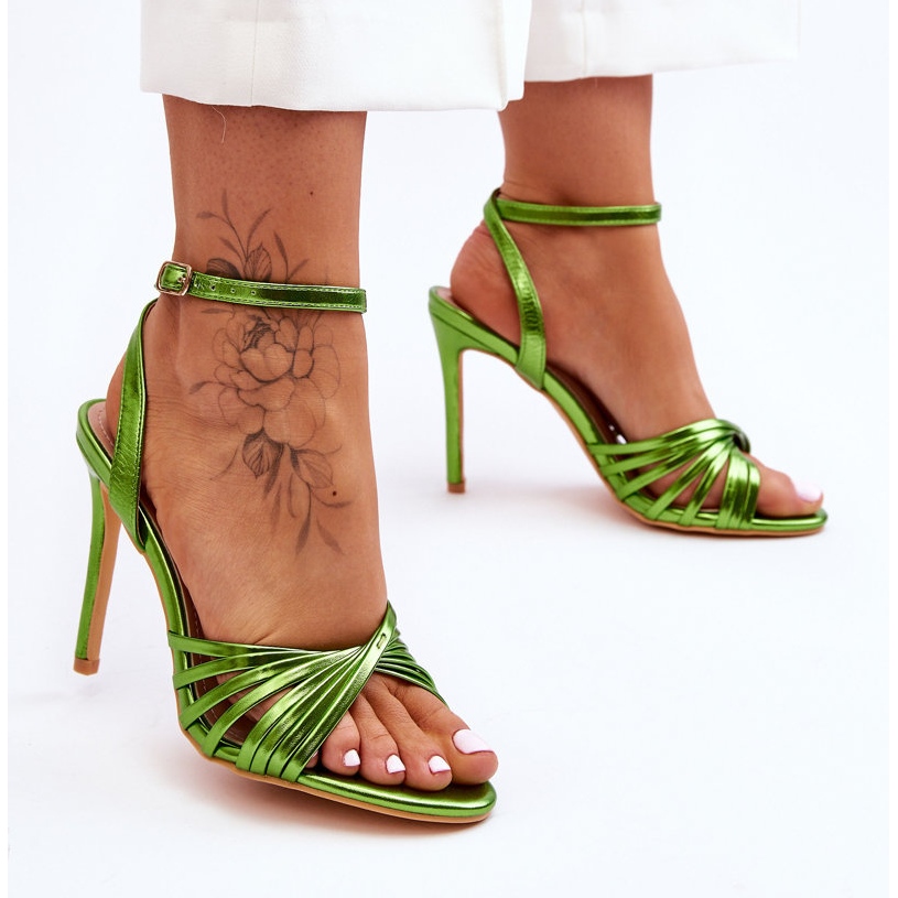 Sandálias elegantes em um alfinete em uma cor verde e elegante - perfeita para passeios noturnos, festas e celebrações de verão. Feito de couro ecológico, com um dedo do pé respirável, aberto e tiras decorativas e amarradas na frente. As sandálias são presas ao redor do tornozelo por uma fivela ajustável, incorporada em um salto alto e alto com uma altura de 10,5 cm. Corte clássico em uma edição moderna - elegante e feminina.
