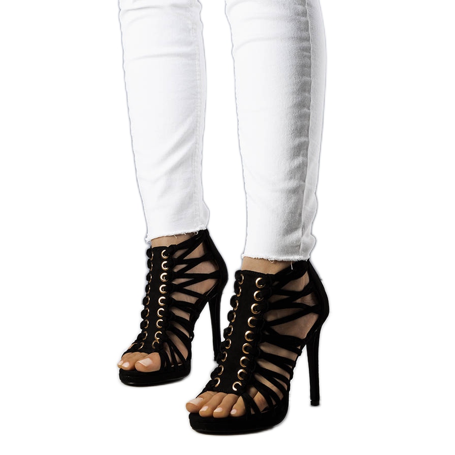 Sandálias elegantes, femininas e sensuais - Pompis são uma proposta que complementará todas as estilização noturnas. Os pinos clássicos e finos, com uma altura de 11,5 cm, moldam lindamente a figura, e a plataforma sutil e uma inserção suave feita de couro ecológico garantem maior conforto de uso. A parte superior feita de couro ecológico de camurça em uma cor preta clássica e detalhes abertos dão leveza e elegância. O modelo é fechado com uma trava prática, o que facilita a configuração.