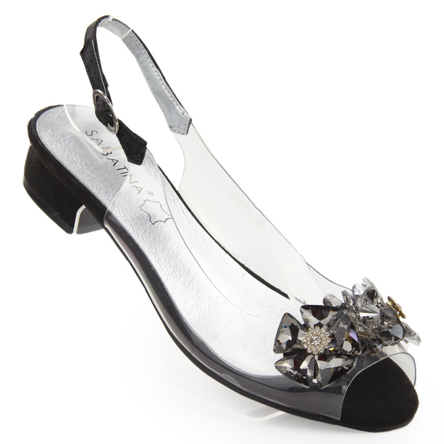 Descubra uma nova dimensão de elegância com sandálias de tonel de bordo transparentes com pedras pretas da renomada marca Sabatina. Essas sandálias extremamente elegantes combinam estilo e conforto, o que os torna a escolha perfeita para os dias de verão.
