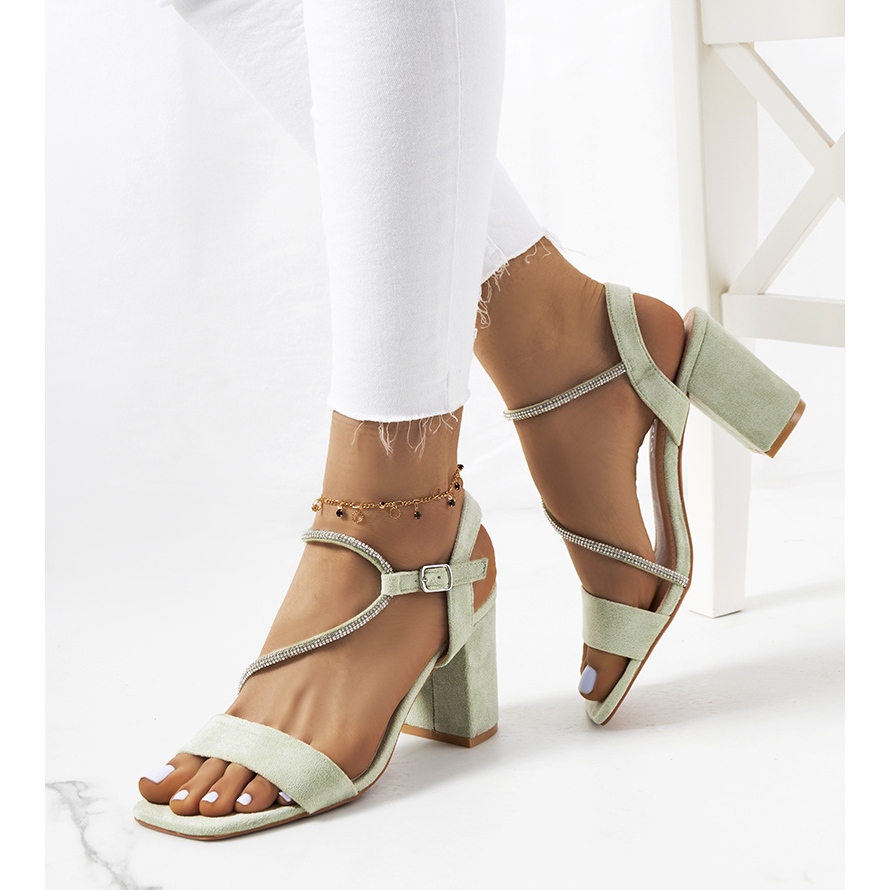 A parte superior das sandálias é confeccionada em couro camurça ecológico de alta qualidade no moderno tom pistache, que se adapta perfeitamente às tendências atuais. As sandálias têm um design clássico que vai ficar bem tanto no estilo do dia a dia quanto em ocasiões especiais. Uma vantagem adicional são os zircões, que lhes conferem um brilho sutil.