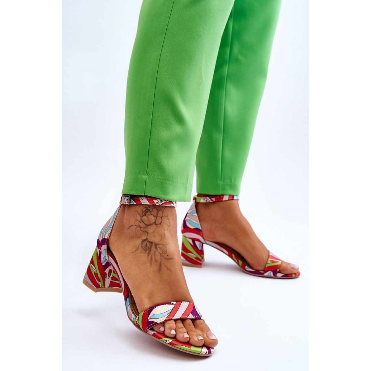 As sandálias são equipadas com salto reforçado e tira ajustável presa no tornozelo, o que garante estabilidade e conforto no uso. A biqueira aberta e arredondada acrescenta sutileza e a palmilha em couro ecológico garante conforto mesmo durante o uso prolongado.