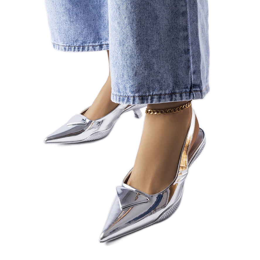 Apresentamos as sandálias de salto baixo prateadas Gougeon, que são a combinação perfeita entre elegância e conforto. Estas elegantes sandálias de pato apresentam biqueira fechada e salto aberto, o que as torna práticas e modernas. Graças ao elástico, calçar e tirar o calçado é extremamente fácil e confortável.