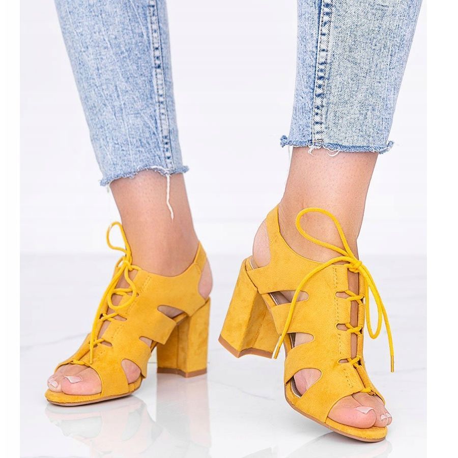 Detalhes: Sandálias amarradas com mostarda no poste da Isabella amarelo