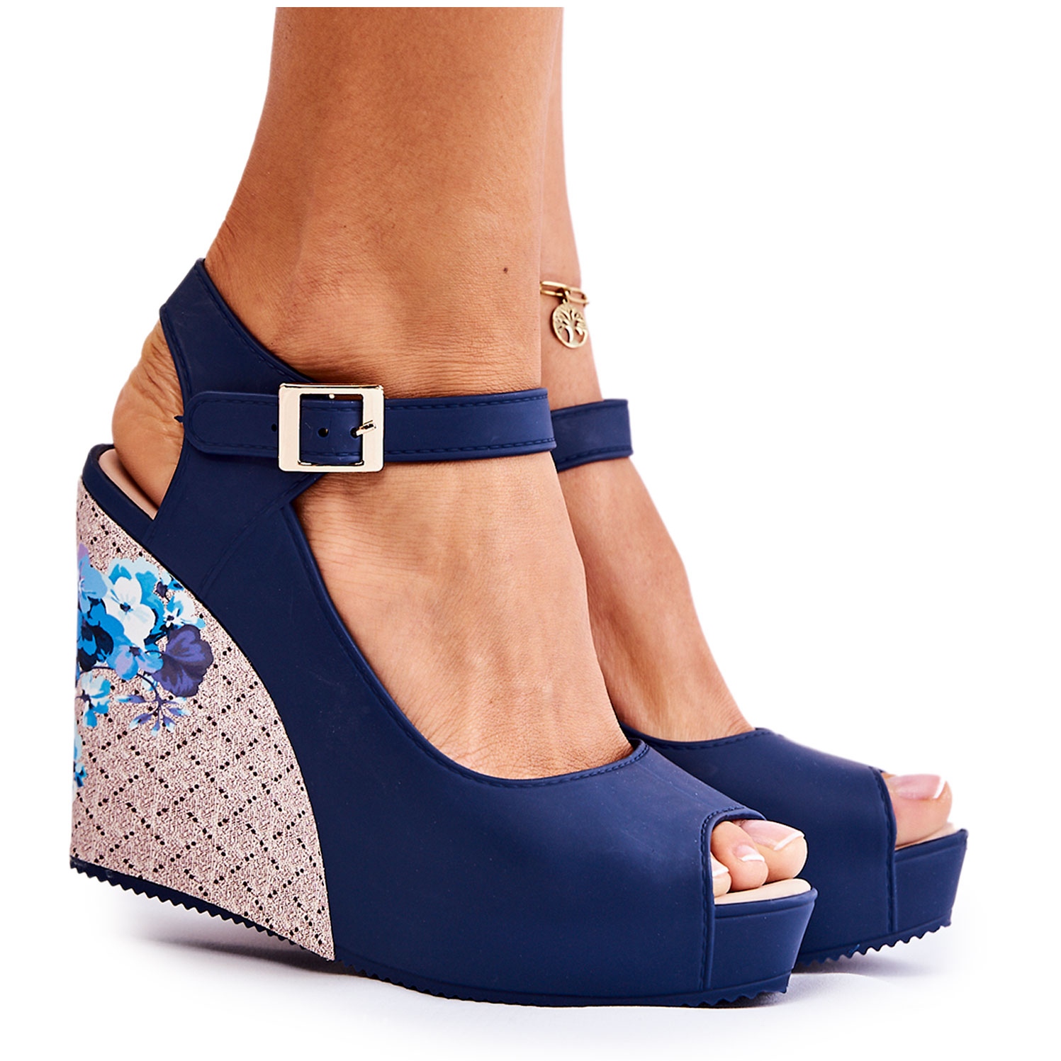 A cor azul marinho combina perfeitamente com qualquer estilo de verão, e o corte clássico os torna um complemento perfeito tanto para vestidos arejados quanto para shorts. Uma cunha alta e estável de 10 cm não só levanta, mas também alonga opticamente as pernas, acrescentando autoconfiança e elegância.