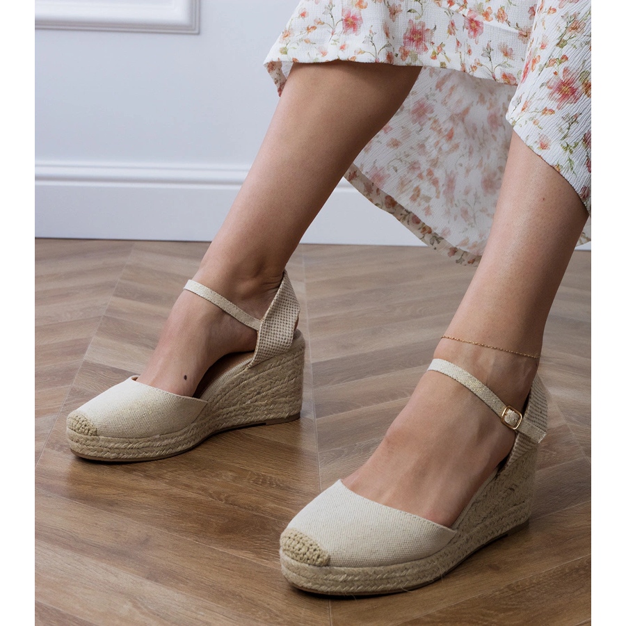 Detalhes: Sandálias bege alpargatas na cunha