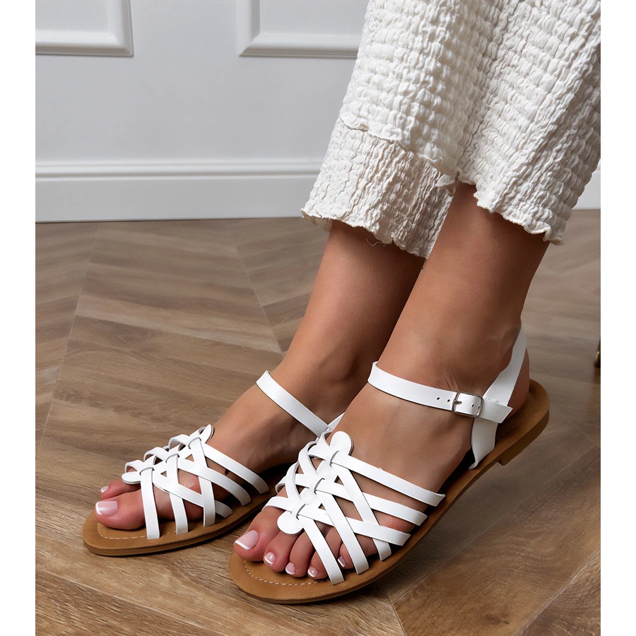 Detalhes: Sandálias brancas embrulhadas em uma sola plana branco