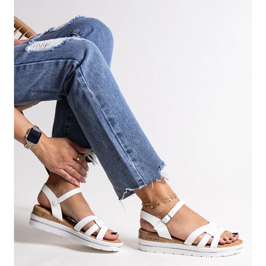 Uma cunha de 5 cm de altura fornece uma altura apropriada, sem desistir da conveniência. Graças à fivela prática, as sandálias são fáceis de colocar e decolar, o que as torna uma escolha ideal diariamente e para ocasiões especiais. Sua cor branca e corte minimalista fazem com que eles se misturem perfeitamente com várias roupas - de vestidos arejados a estilizações com calças curtas.