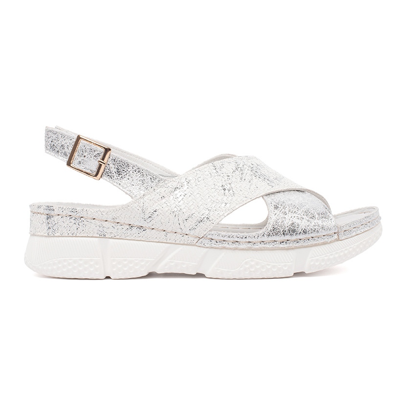 O material externo é o couro ecológico, que não apenas parece atraente, mas também é fácil de cuidar. O interior das sandálias é preenchido com uma confortável inserção de couro natural, o que garante um ajuste perfeito e um conforto. A fixação da fivela permite a colocação rápida e fácil, e a cor branca clássica faz dessas sandálias um complemento elegante para qualquer estilização.