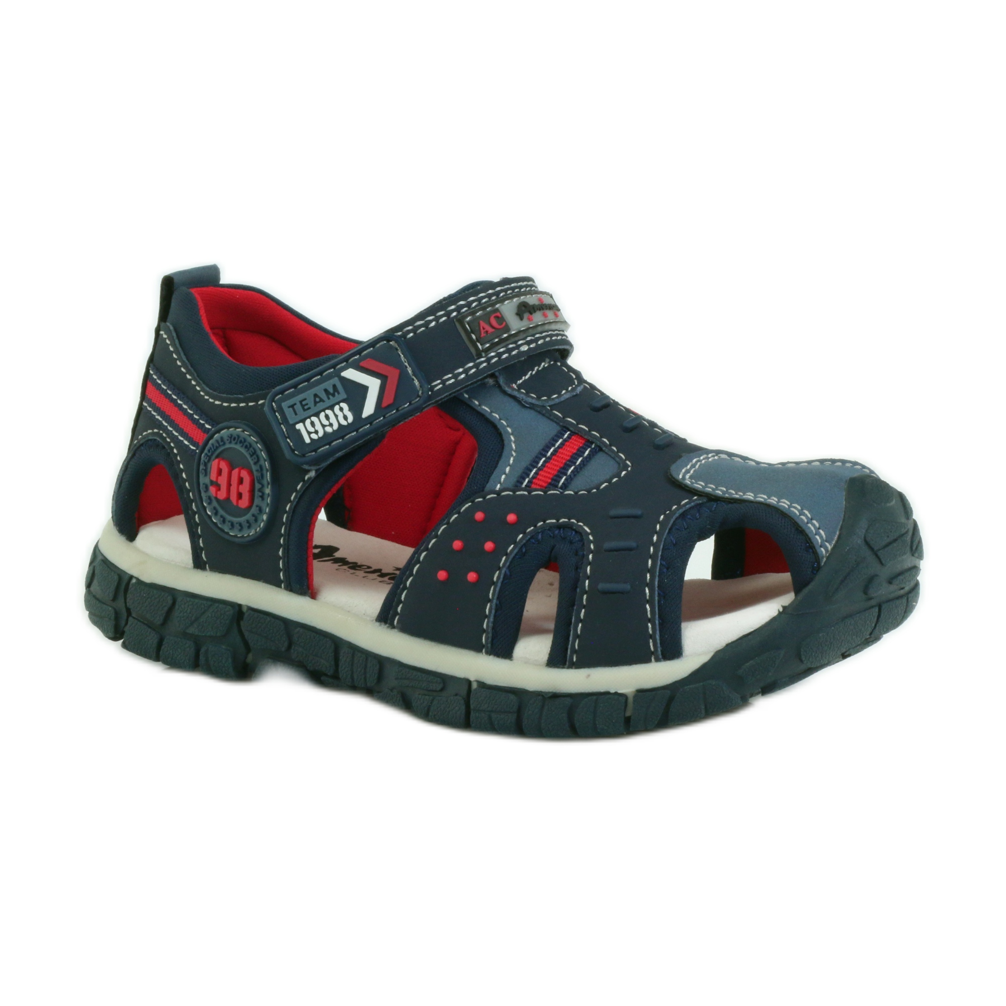 As sandálias American Club também têm um design atraente. A interessante combinação do azul marinho com detalhes em vermelho faz com que o calçado fique lindo nos pés de qualquer menino. Graças ao fecho de velcro, calçar e tirar o calçado é rápido e cómodo, o que é uma vantagem adicional no uso diário.