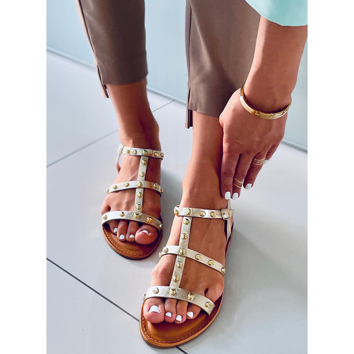 Descubra a elegância do verão com as sandálias Neha Gold numa espetacular cor dourada! Estas sandálias rasas femininas são o complemento perfeito para qualquer estilo de férias. O seu acabamento metálico realçará perfeitamente o seu bronzeado e as tachas expressivas darão carácter a cada passo.
