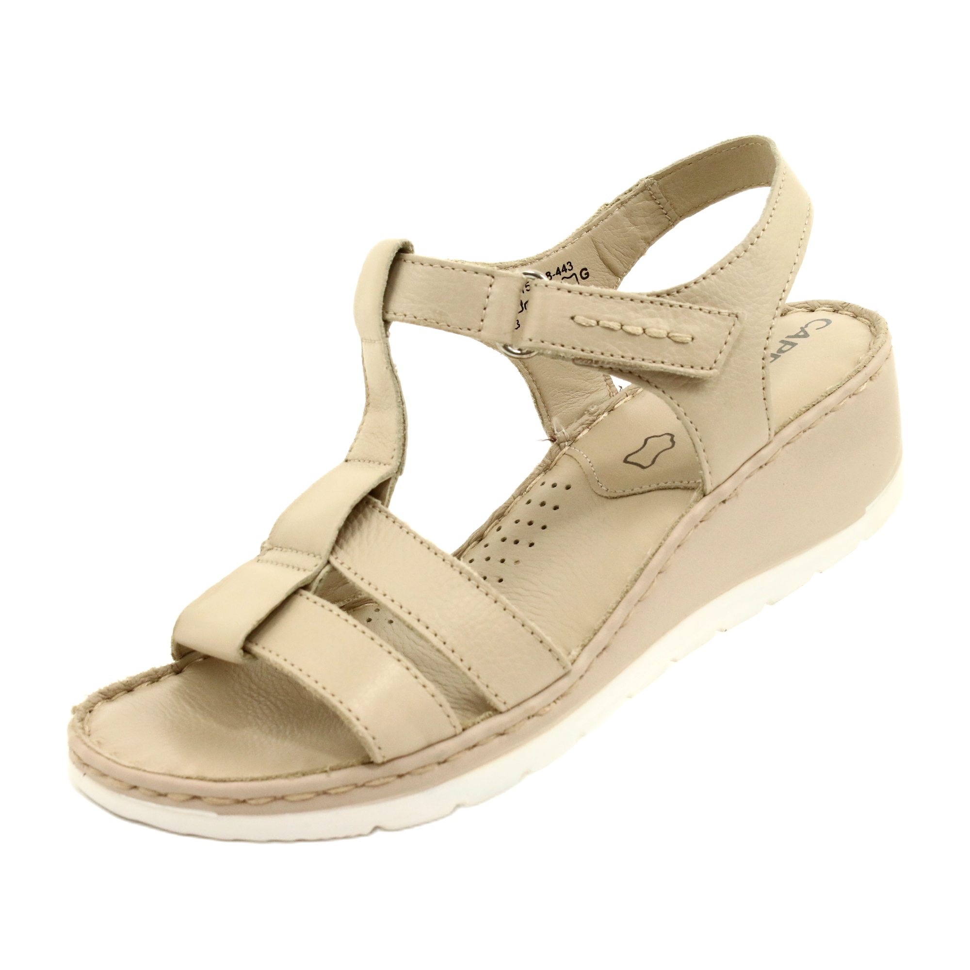 As sandálias femininas de capricletes elegantes e extremamente confortáveis, feitas de couro natural e macio em um tom clássico de bege (bege). Ideal para mulheres que valorizam o conforto todos os dias-uma inserção de couro macia se adapta ao pé, e a leve e flexível plataforma-caturna (4,5 cm de altura) garante estabilidade e elevação sutil da silhueta. A fixação do velcro garante a colocação rápida e conveniente e um ajuste perfeito.