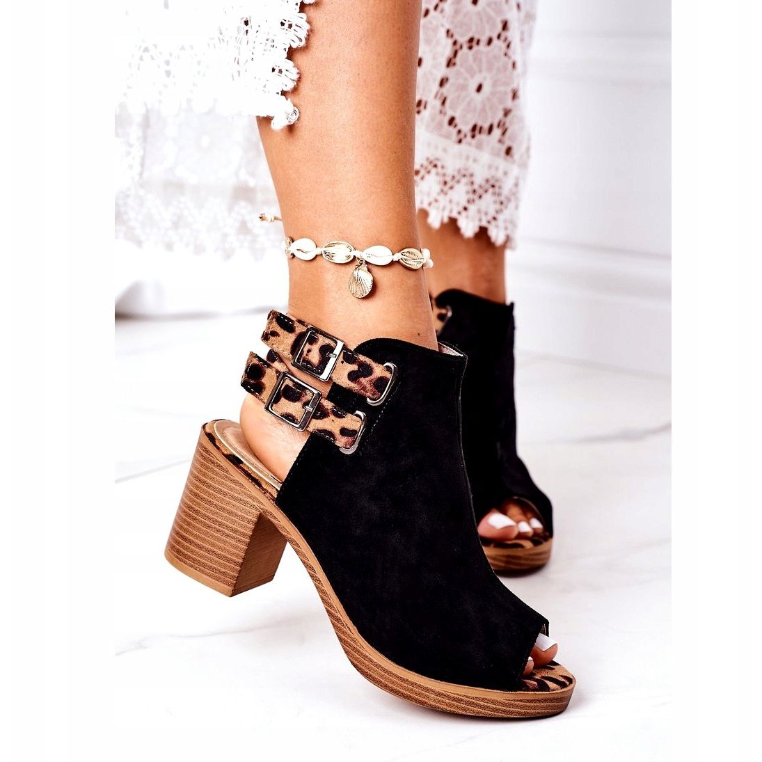 Detalhes: Sandálias de camurça em um bar Lu Boo Black Leopard castanho preto