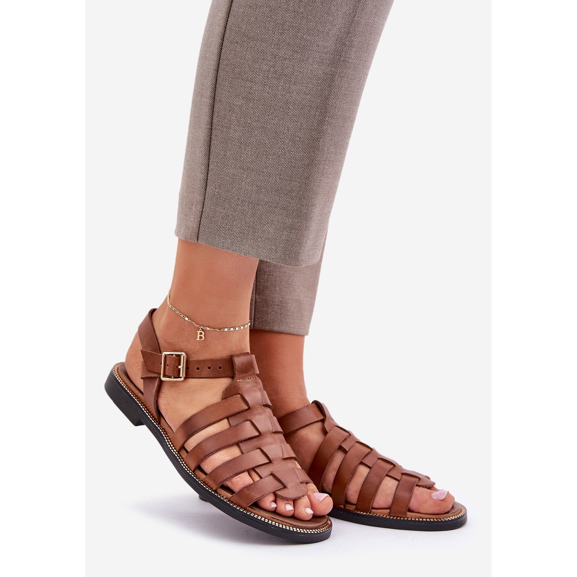 Detalhes: Sandálias de couro com saltos planos Zazoo 3686 Camel marrom