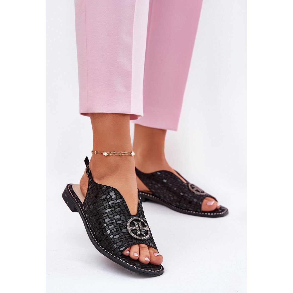 Detalhes: S.Barski Sandálias de couro de salto plano com um ornamento de S. Barski KV51-094 Black preto