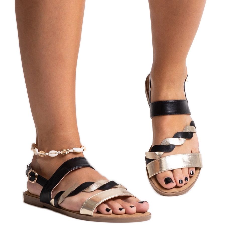 A cor dourada com detalhes em preto é um sucesso da temporada que permitirá que você se destaque da multidão e se sinta confiante e atraente. As sandálias desta coleção são perfeitas para uma caminhada na praia e para uma noite de verão na cidade.