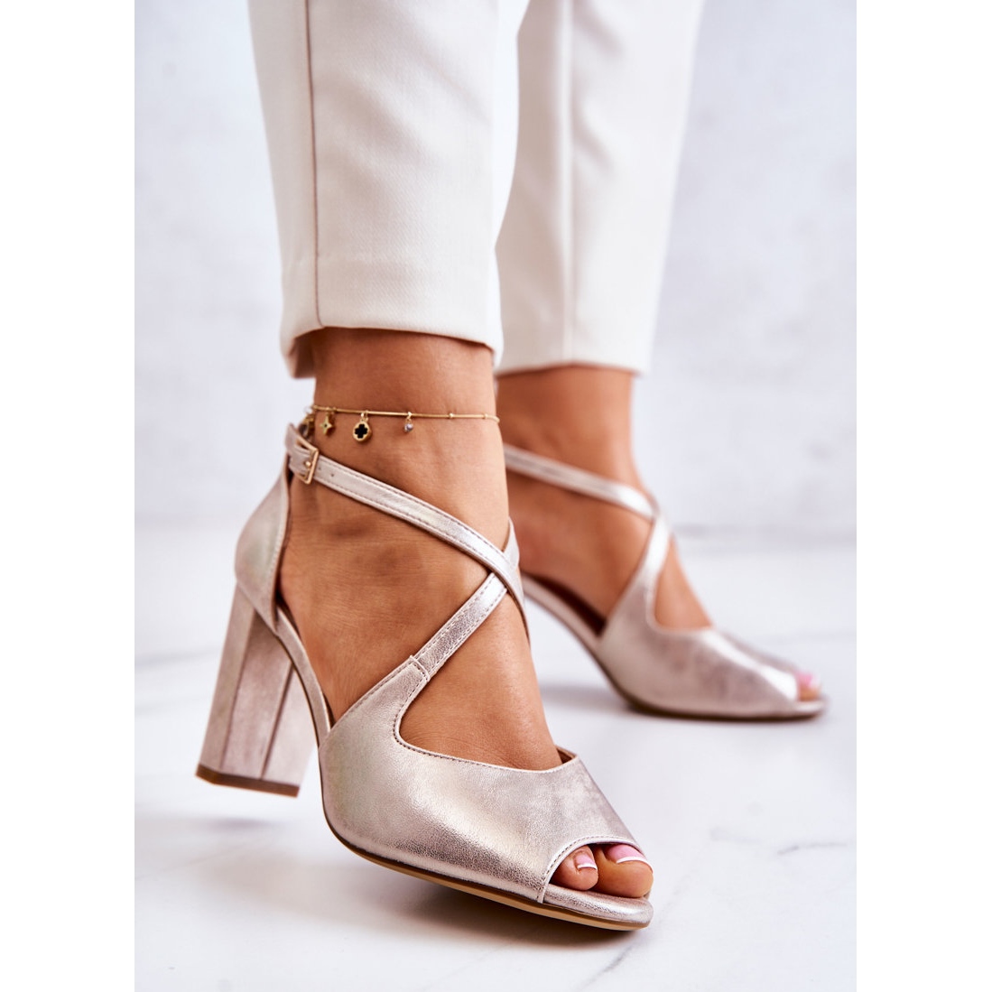As sandálias distinguem-se pelo salto de 8,5 cm de altura, o que garante estabilidade e conforto de uso. Alças ajustáveis com fecho de fivela conveniente permitem um ajuste perfeito, e dedos abertos e calcanhar rígido adicionam um caráter clássico.