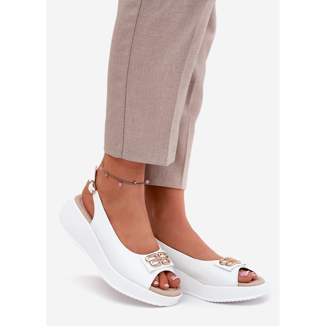 Descubra o conforto e elegância únicos com sandálias femininas de couro na cunha S. Barski LR51-593 em uma cor branca clássica. Essas sandálias elegantes, feitas de couro natural, são uma ótima solução para dias mais quentes, complementando perfeitamente as estilizações de verão.