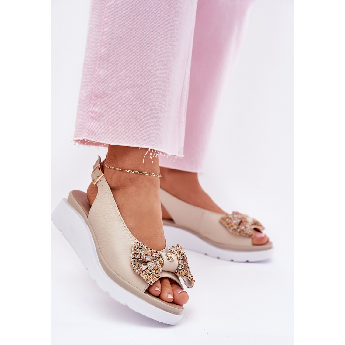 Detalhes: Sandálias de couro feminino com uma cunha com um arco bege zazoo 1882