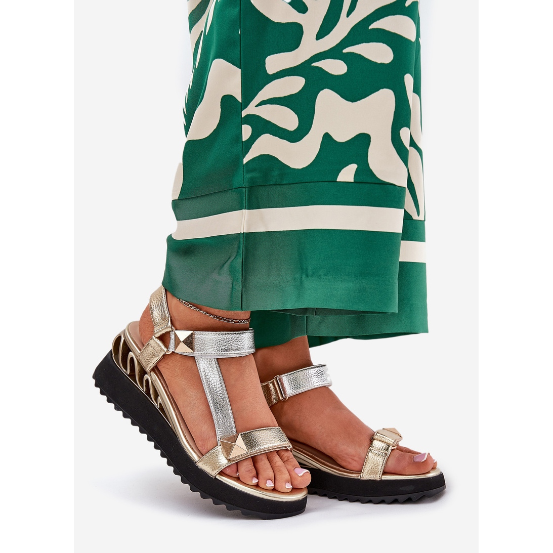 Uma cunha de 7 cm de alta oferece excelente estabilidade e uma plataforma de 2,5 cm de altura adiciona conforto ao caminhar. As sandálias estão disponíveis em uma cor dourada elegante, com detalhes em prata adicionais que se misturam bem com muitas estilizações de verão. As solas de plástico preto garantem durabilidade e adesão adequadas.