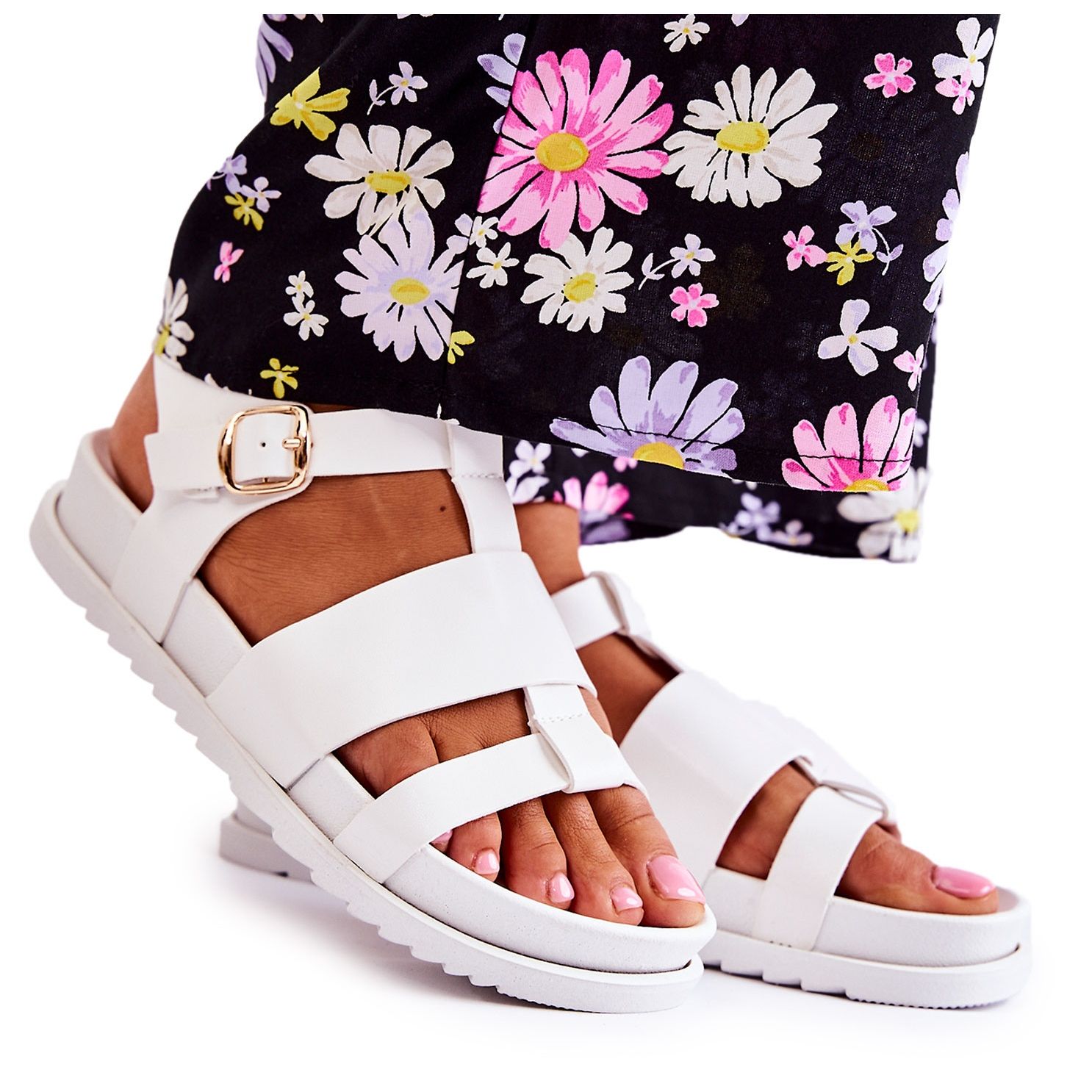 As sandálias têm bico aberto e arredondado e salto aberto, o que valoriza seu design moderno. A palmilha de plástico macio e perfilado garante conforto mesmo durante um longo dia. Além disso, a altura da plataforma de 3,5 cm torna o calçado não só elegante, mas também estável, permitindo-lhe mover-se livremente a cada passo.