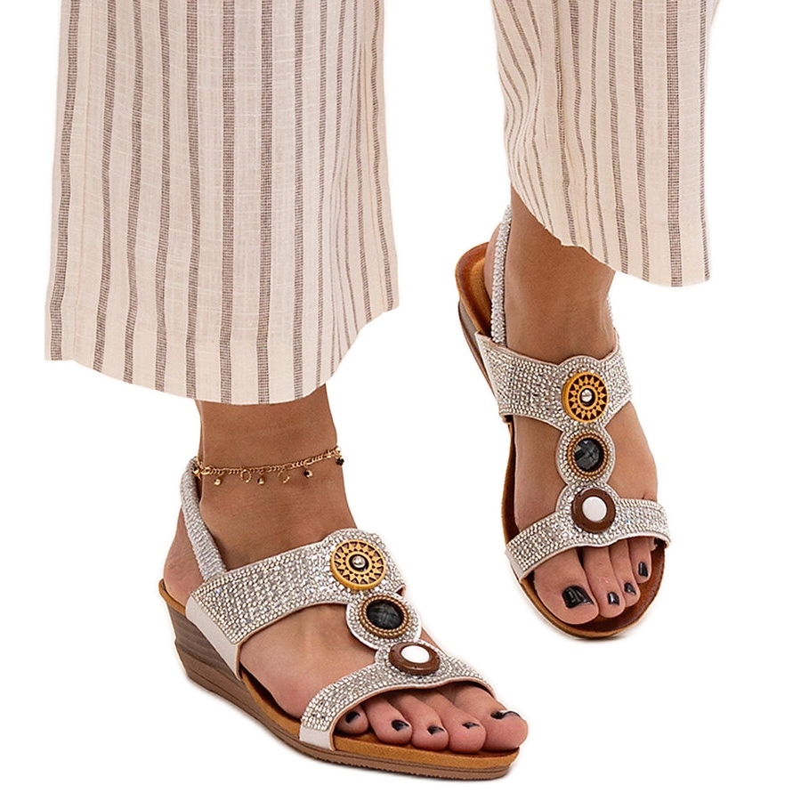 Sandálias decoradas com zircões eficazes apresentam uma nota de brilho a cada estilização de verão, tornando -os parte integrante do guarda -roupa de todas as mulheres da moda. A cunha de 4 cm de alta lhes dá uma aparência característica, que se encaixa perfeitamente nas tendências atuais. Prata em combinação com uma sola bege significa que essas sandálias combinam com muitas roupas - de vestidos arejados a shorts de verão.