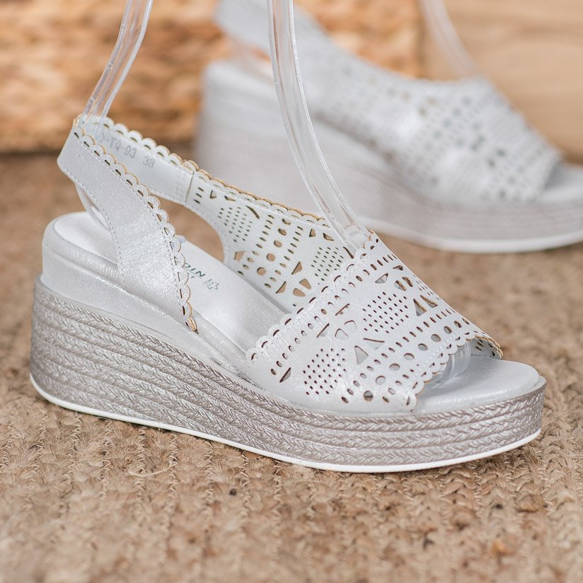 A parte superior das sandálias é confeccionada em material de alta qualidade imitando couro cinza e se diferencia por um padrão assimétrico e perfurado que permite que os pés respirem livremente mesmo em dias quentes. A cunha trançada de 7,5 cm de altura acrescenta classe e levanta suavemente a silhueta, garantindo estabilidade e conforto ao caminhar.