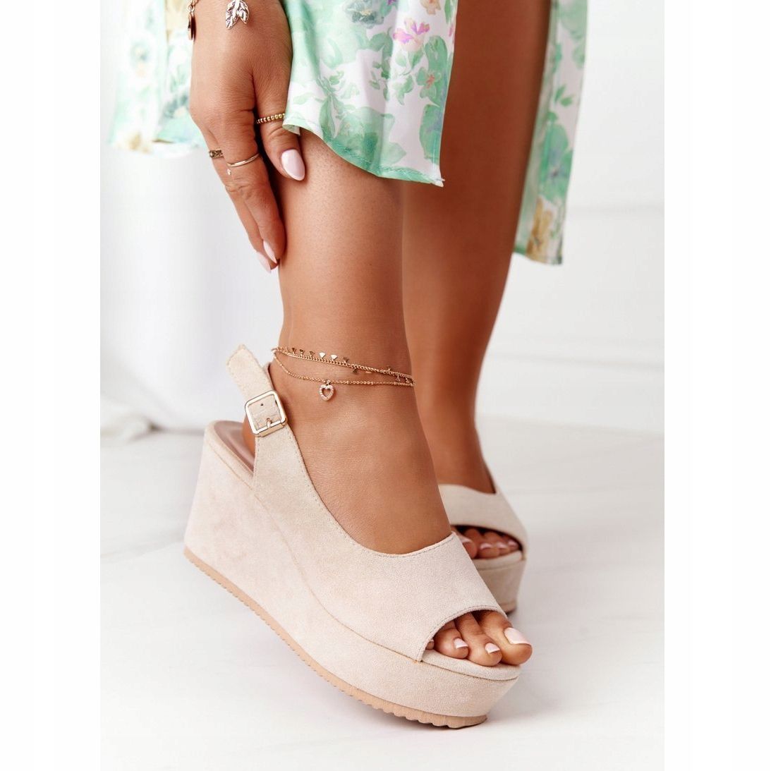 Graças à altura da cunha de 8,5 cm e à plataforma de 4 cm de largura, você pode desfrutar do efeito de pernas alongadas sem sacrificar o conforto ao caminhar. As sandálias estão equipadas com uma prática fivela, que permite um fácil ajuste ao pé.