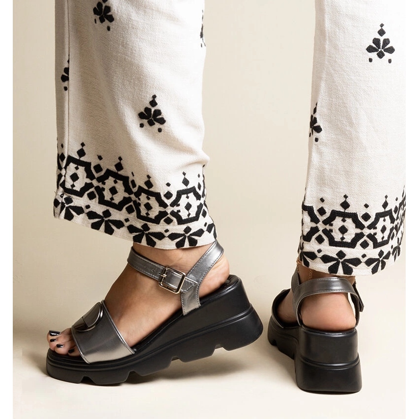 Uma cunha alta com uma altura de 7 cm não apenas adiciona alguns centímetros de altura, mas também faz você parecer elegante. A "arma" de cor prateada em combinação com uma sola de plástico preto torna essas sandálias extremamente versáteis - ideais para muitas estilizações de verão, tanto diariamente quanto para ocasiões especiais.