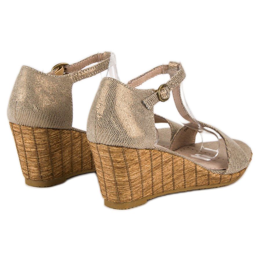 As sandálias têm cunha estável de 6,5 cm de altura, o que as torna confortáveis para usar o dia todo. Graças à fivela, pode ajustá-los facilmente ao pé, o que também afecta o conforto da sua utilização. O interior das sandálias é revestido em couro ecológico, o que garante o prazer de calçar e o cuidado com o meio ambiente.